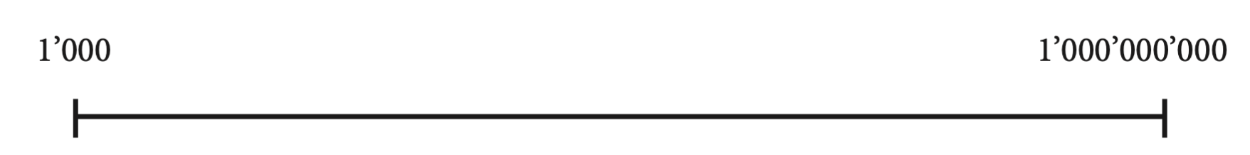 Pour arriver à une compréhension meilleure de la loi de Benford l’auteur nous propose de questionner notre « sens inné des nombres », dans le paragraphe éponyme. Je vous invite à suivre l’auteur en prenant une feuille de papier, de tracer une droite horizontale, d’y marquer deux points (à une distance de 10 cm ou plus). Le point à gauche est étique mille (1’000) et le point le plus à droite sera étiqueté un milliard (1’000’000). Maintenant, l’auteur vous demande de placer le point que l’on marquera avec l’étiquette un million (1’000’000). Quel que soit le placement de votre point million, l’auteur vous demande de bien réfléchir à votre placement et à le justifier. Essayez, le résultat en vaut la peine!