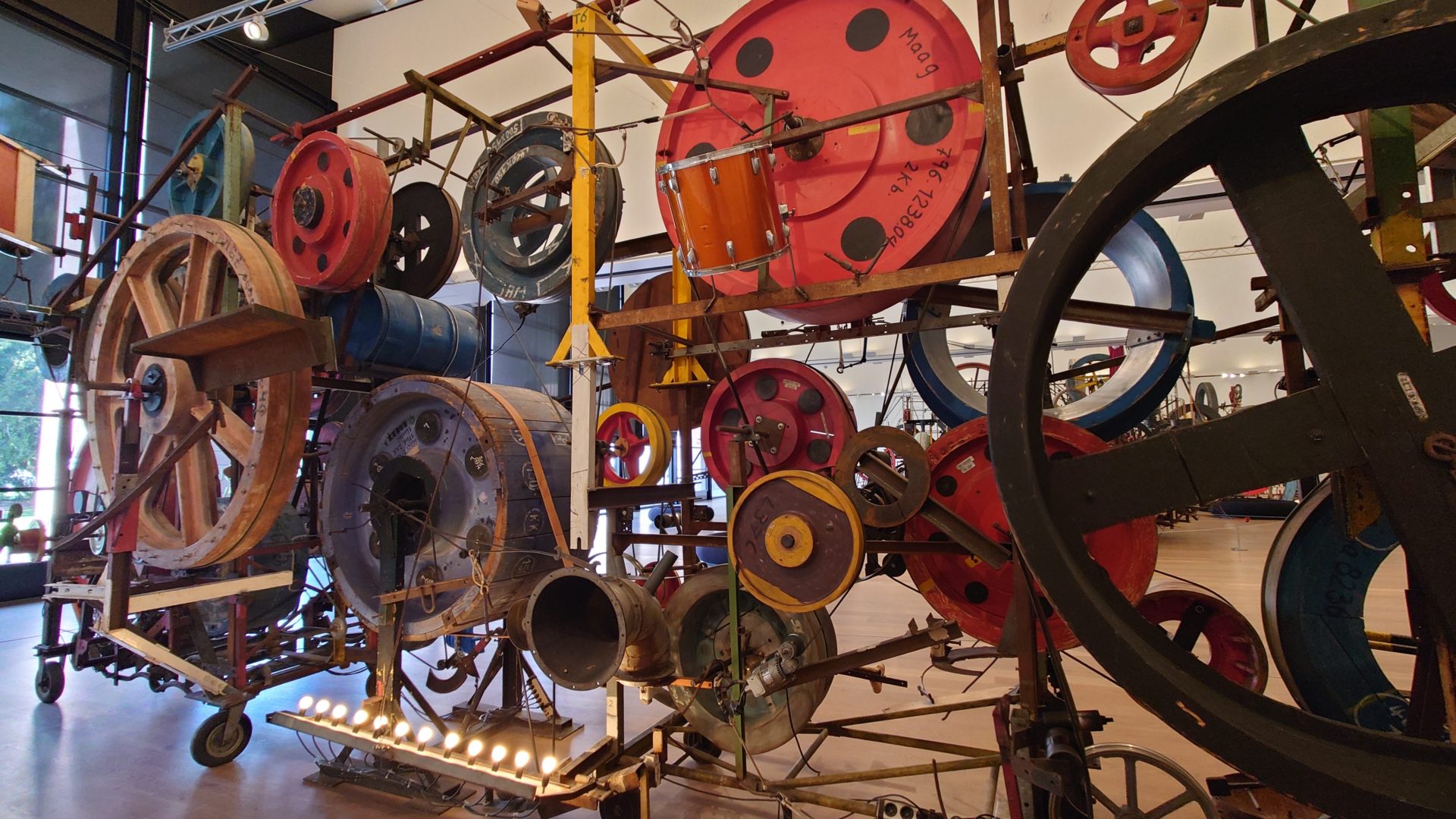 On découvre en entrant les premières œuvres de l’artiste, les plus délicates, où le mouvement est subtil, presque hésitant. Suivent les Méta-Matics : d’incroyables « machines à dessiner ». En actionnant un mécanisme, la machine se met en branle et crée une œuvre d’art abstraite unique sur une feuille de papier. Des esquisses et documents laissés par l’artiste dévoilent son processus créatif et son imagination débordante, permettant une plongée intime dans son esprit visionnaire. Le cœur de la visite bat dans l’immense halle des Sculptures Monumentales. Ici les rouages tournent, les courroies grincent et les objets s’entrechoquent dans un ballet tantôt harmonieux, tantôt cacophonique. Certaines sculptures nous invitent même à nous aventurer à l’intérieur de la structure, nous happant dans un univers mécanique et onirique.
