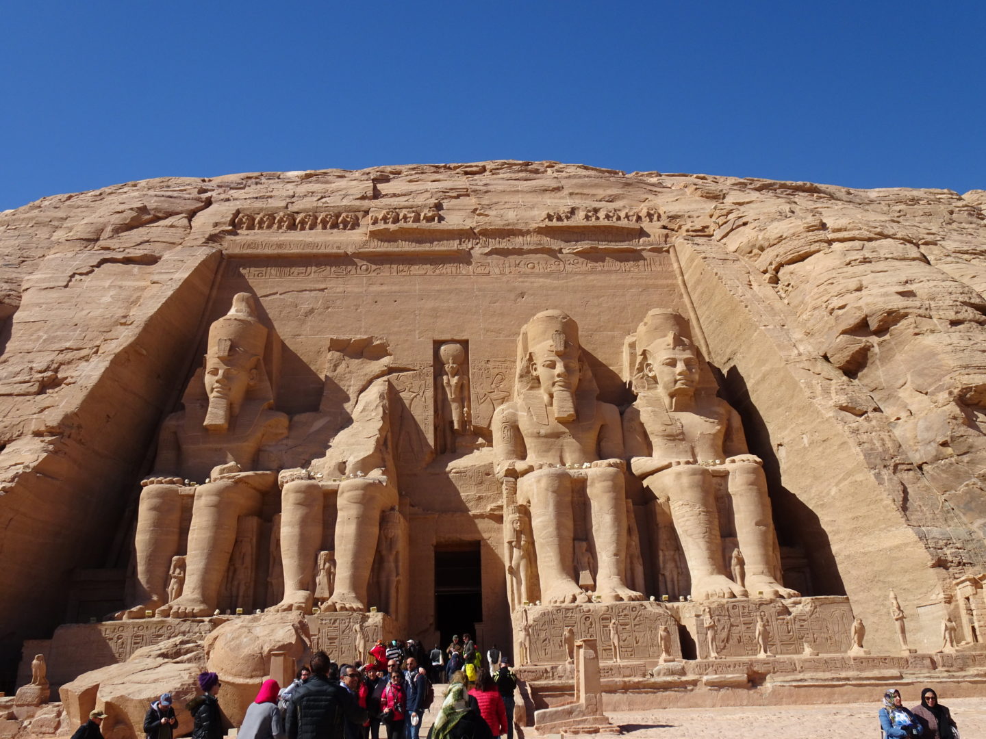 Quant aux temples d’Abou Simbel (déplacés sur une colline artificielle bloc par bloc pour laisser la place au lac de retenue Nasser), ils ont été construits par le pharaon Ramsès II (XIXème dynastie) vers 1260 av. J.-C. pour commémorer sa victoire à la bataille de Qadesh. Ils avaient également pour vocation de célébrer son culte, celui des dieux et celui de son épouse bien-aimée Néferari à qui est dédié, sous la forme de la déesse Hathor, le petit temple, à petite distance de l’édifice principal.