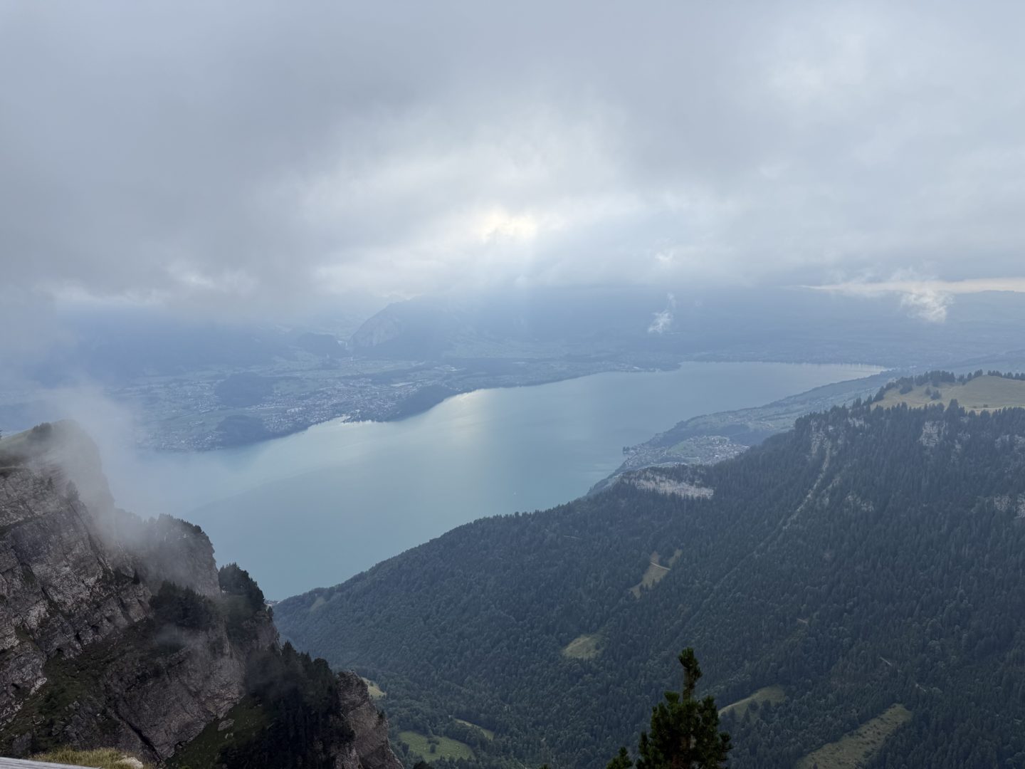 Le vendredi, les prévisions étaient beaucoup moins optimistes et le samedi matin encore pire, mais « alea jacta est ». Donc voyage en train jusqu’à Interlaken, puis bus jusqu’à Beatenberg, dans un décor de carte postale avec de superbes vues sur le lac de Thoune en contrebas. Depuis l’hôtel, nous avons pris le bus jusqu’à l’arrivée du funiculaire et sommes redescendus au bord du lac de Thoune jusqu’au Sesrestaurant Beatenbucht où nous attendaient un verre de vin ou une autre consommation et une petite pizza en guise d’apéritif. L’endroit est doté d’une magnifique terrasse intérieure et extérieure s’avançant sur le lac.